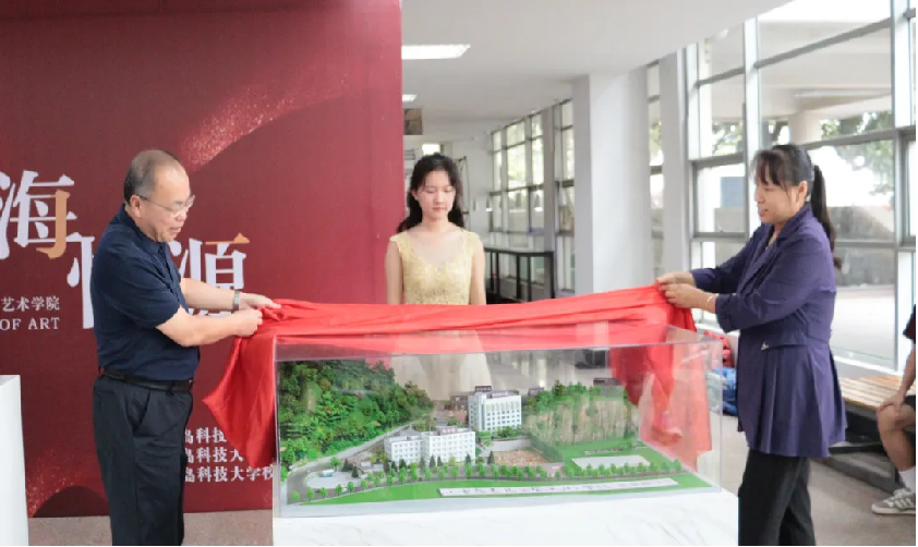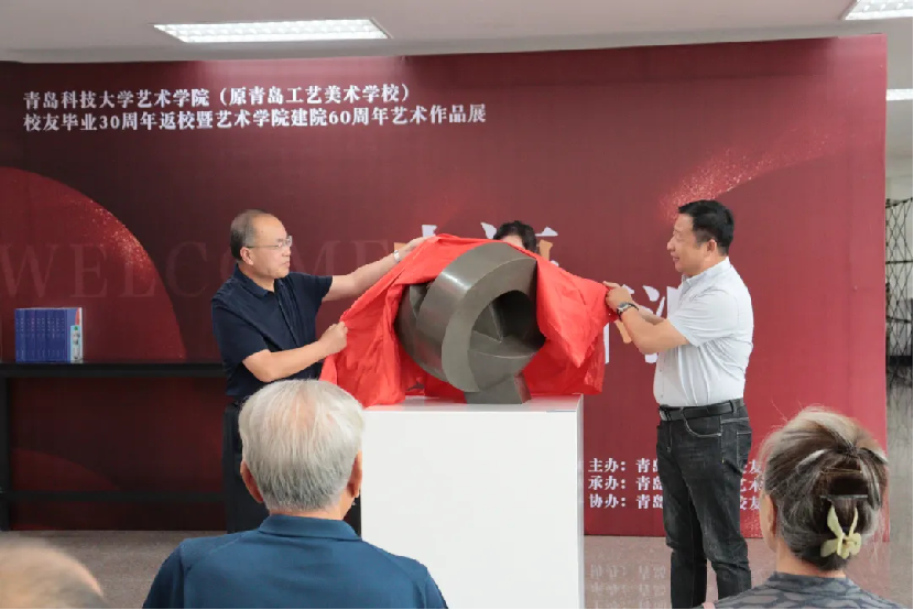 校友朱林在校庆70周年时,曾向学校捐赠雕塑作品《艺术时代》,在此次建院60周年之际,再次为学院捐赠雕塑作品《甲子》,由丁林和朱林共同为作品揭幕并颁发收藏证书。校友袁翠华,在国庆70周年之际代表山东省制作了黄岛地下油库模型,此次为学院捐赠“原青岛工艺美校校址模型”,由丁林和袁翠华共同为作品揭幕并颁发收藏证书。在本次院庆活动中,还有葛正礼、刘培习、李建波、韩庆强、魏仁博、张晗东等一百多位校友为院庆活动捐款捐物。