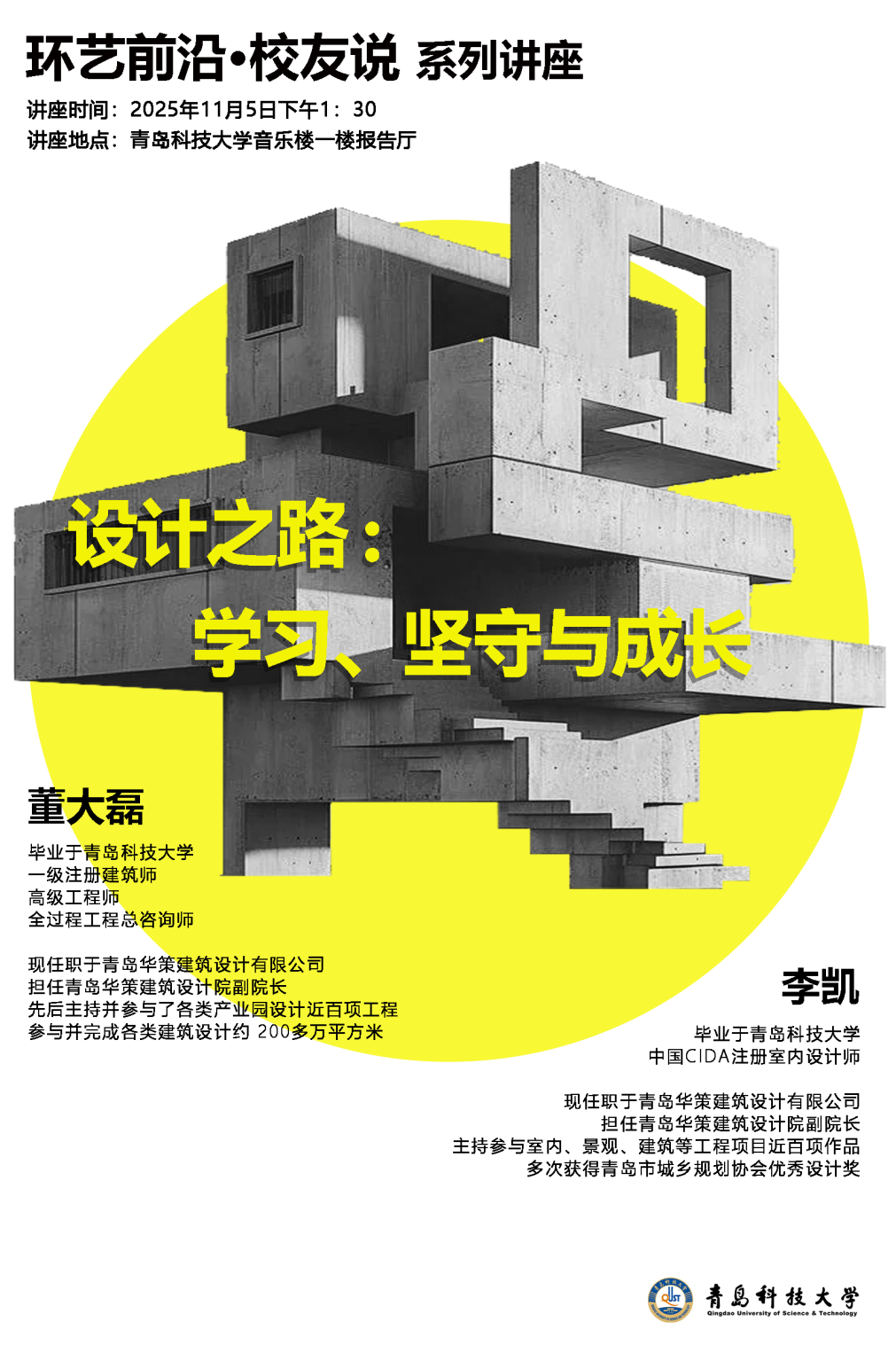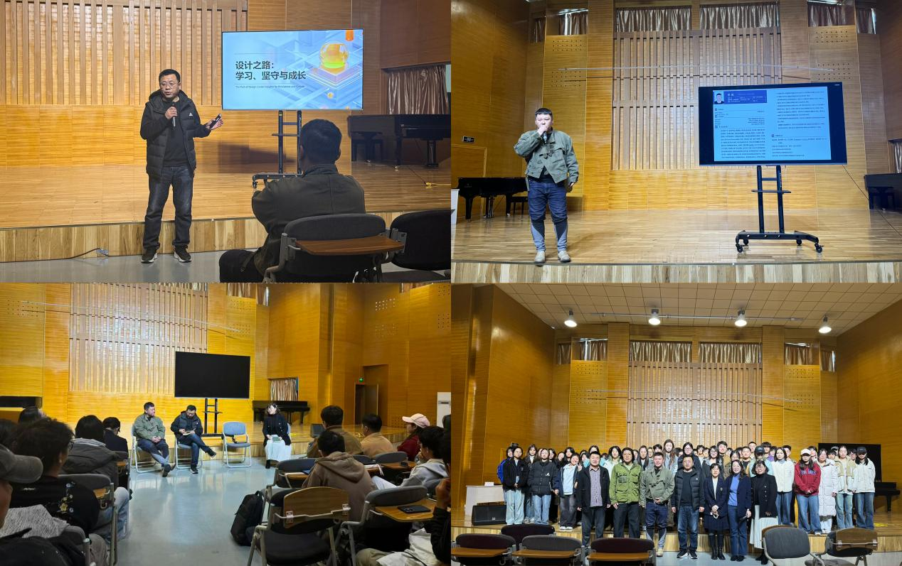 环境设计系主办的“环艺前沿・校友说”系列讲座在艺术中心音乐厅正式启幕。本次讲座特邀学院环境设计2002级杰出校友董大磊、李凯,2001级杰出校友曾彬彬重返母校,以“设计之路:学习、坚守与成长”为题,为在场师生带来了一场兼具行业深度与人生温度的思想盛宴。