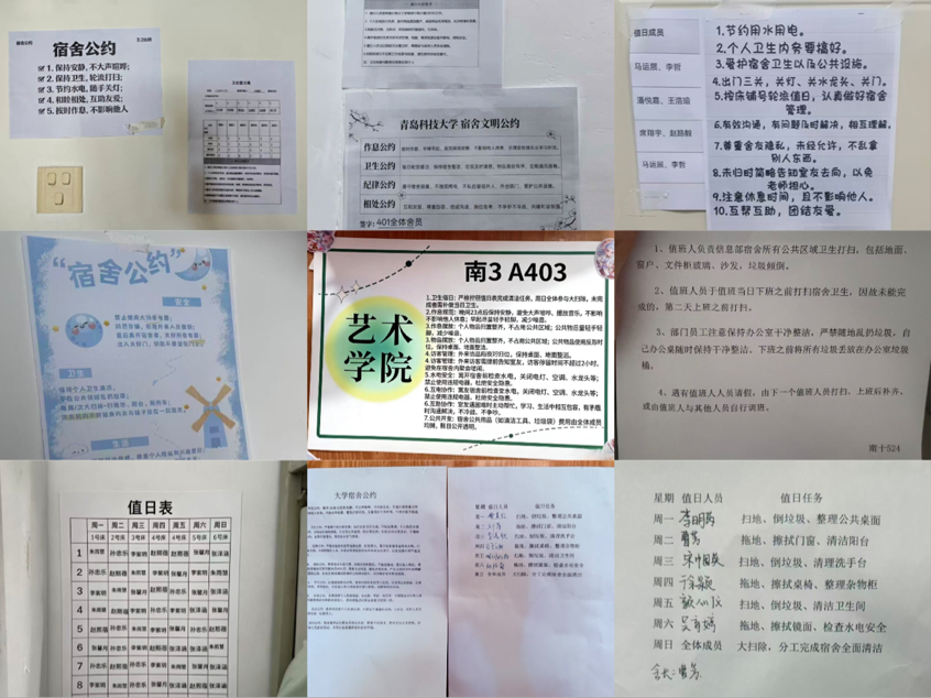 活动过程中,学院首先组织各宿舍集体讨论、共同制定了符合本宿舍特点的《宿舍文明公约》,明确了成员在安全、卫生、作息、人际关系等方面的行为规范与共同承诺,有效提升了学生的规则意识与集体归属感。同时,学院依据前期制定的《学生宿舍轮流值日制度》,指导各宿舍细化了值日安排,将卫生清洁、安全检查等责任落实到人,并统一制作、张贴了值日表,建立了规范的学院备案机制。此外,学院还就宿舍公约的履行情况和值日制度的落实情况组织了专项检查与座谈交流,广泛听取学生的意见和建议,确保各项制度贴近实际、行之有效。