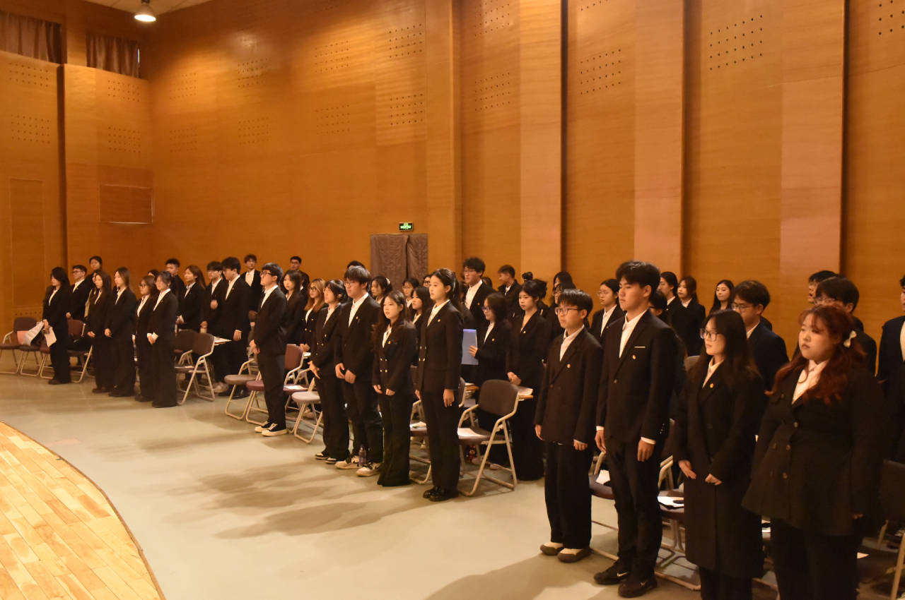 随后,仪式进入议程宣读环节。宋晨曦老师代表学院宣读《艺术学2025-2026学年“青马工程”实施方案》,从培养目标、课程体系、实践安排、考核机制等方面进行详细解读,明确本次培训将采用“理论学习+实践锻炼+榜样引领”的三维培养模式,助力学员全面成长。在全场师生的共同见证下,全体青马学员进行庄严宣誓。“坚定理想信念,传承红色基因,讲好科大故事,传播时代强音,勇担骨干使命,服务师生集体,努力成长为有理想、敢担当、能吃苦、肯奋斗的新时代青年!”铿锵有力的誓言回荡在报告厅内,既是学员们对青春的承诺,更是对责任的担当。