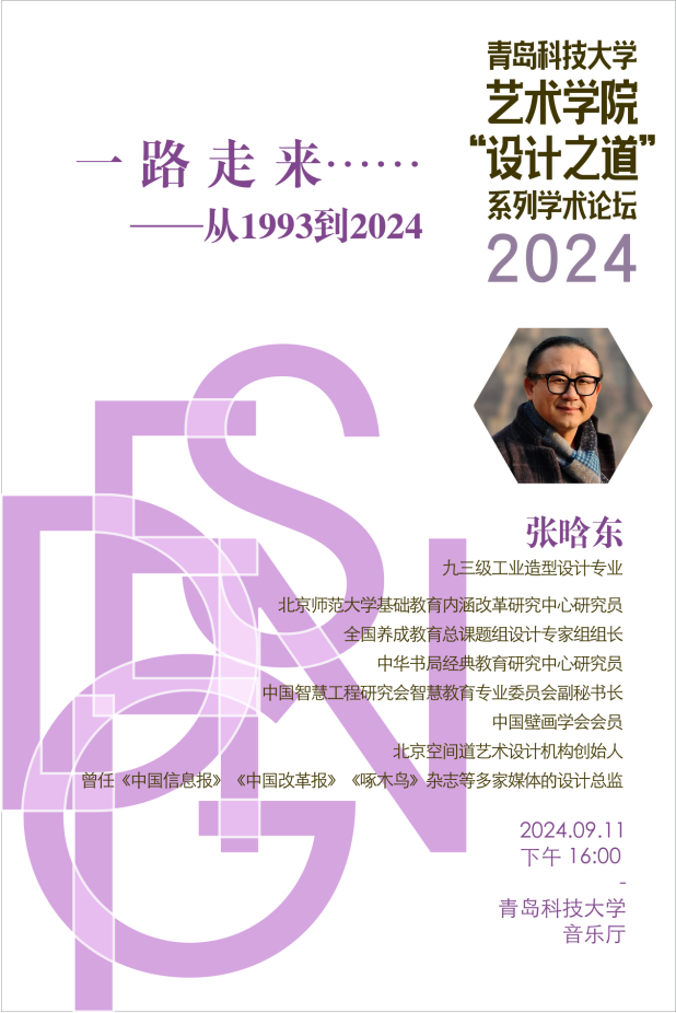“设计之道”系列学术讲座,题目为一路走来-从1993到2024,主讲人:张晗东老师。张老师是九三级工业造型设计专业毕业、北京师范大学基础教育内涵改革研究中心研究员、全国养成教育总课题组设计专家组组长、中华书局经典教育研究中心研究员、中国智慧工程研究会智慧教育专业委员会副秘书长、曾任《中国信息报》中国壁画学会会员北京空间道艺术设计机构创始人、《中国改革报》《啄木鸟》杂志等多家媒体的设计总监。