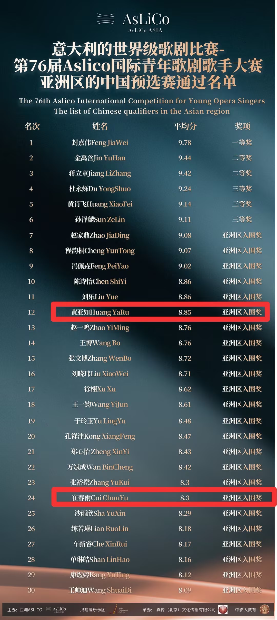 近日,第六十七届意大利AsLiCo国际青年歌剧歌手大赛亚洲区的中国预选赛公布了比赛成绩,音乐系2020级学生崔春雨与音乐系校友、韩国祥明大学博士研究生黄亚如均获得亚洲区入围奖。