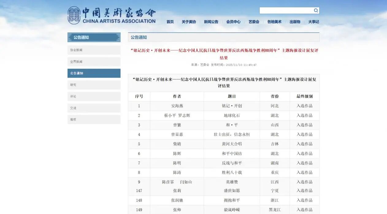 近日,由中国美术家协会、湖北省文化和旅游厅等四单位联合主办的“铭记历史·开创未来——纪念中国人民抗日战争暨世界反法西斯战争胜利80周年”主题海报设计展作品复评结果公示。我院视传231班张帅同学的作品《毅嵗峥嵘》从2846件作品中脱颖而出,成功入选为全国展出164件作品之一。
