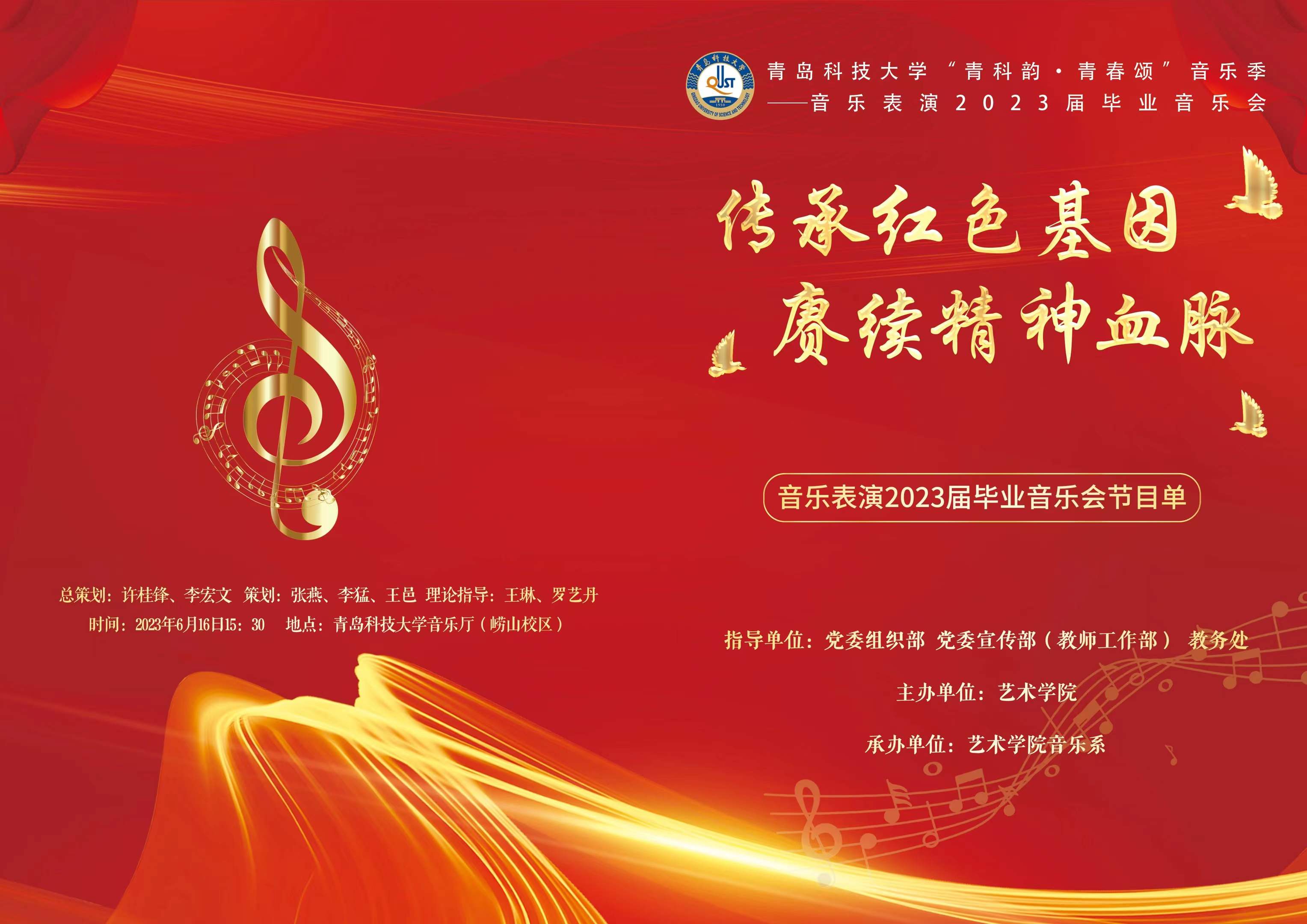 为深入学习贯彻习近平新时代中国特色社会主义思想,坚定不移推进学院高质量发展,激发毕业生荣校爱校情怀,展示音乐专业教育教学与人才培养成果,由学校党委组织部、党委宣传部(教师工作部)、教务处指导,bangumi 主办,音乐系承办的“传承红色基因,赓续精神血脉”主题教育暨2023届音乐专业毕业音乐会,将于2023年6月16日15:30于学校音乐厅举办。