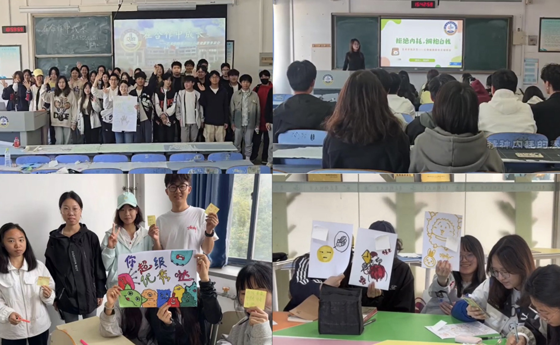 各班心理委员组织开展了心理健康主题班会。环艺241班以“拒绝内耗,拥抱自我”为主题,科普如何应对“精神内耗”;绘画241班组织开展心情签到等游戏;音乐241班以“在合作中成长”的主题,帮助大家了解合作的意义;产品231班开展心理健康教育讲座,引导同学们树立正确的心理健康观念;研究生班级以绘制“生命树”为主题,分享对抗压力的方法。